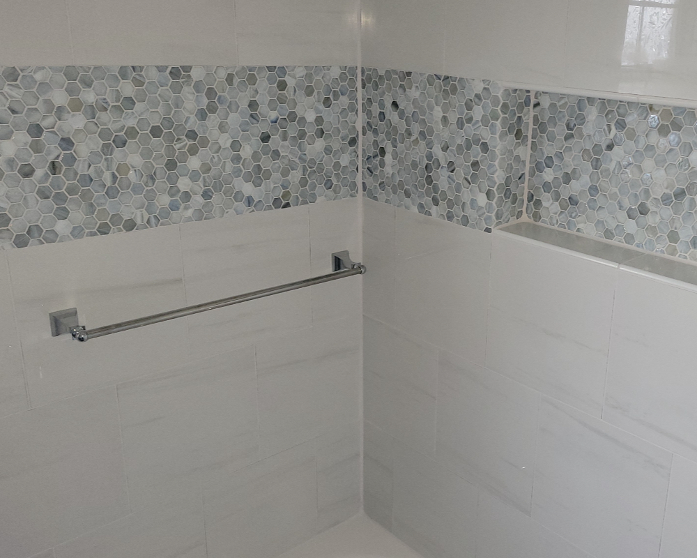 Once the structure was opened up, we prepared the new tub and shower area for tile and added a full-width recessed niche along the back wall. The Lunada Bay glass mosaic chosen by the homeowner was used to highlight this niche, creating a focal point that brings both texture and color into the room.