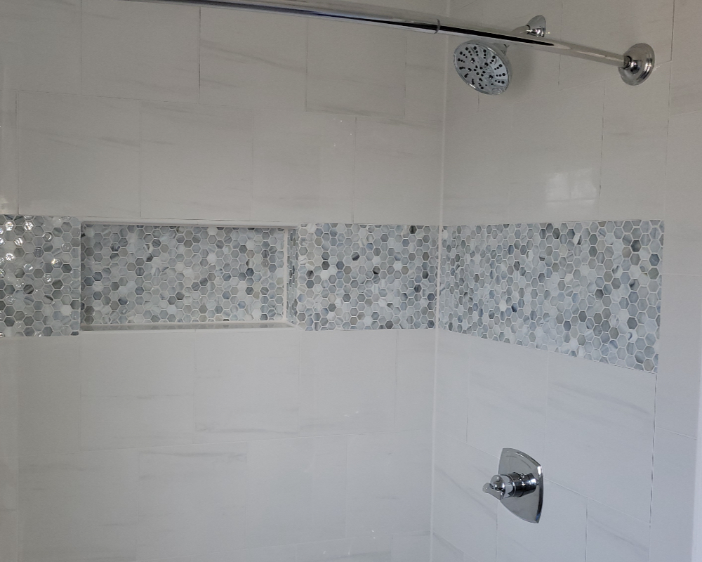Services Provided: Tub replacement, shower tile installation, recessed niche installation, vanity and countertop installation, flooring replacement, painting, plumbing fixture installation
