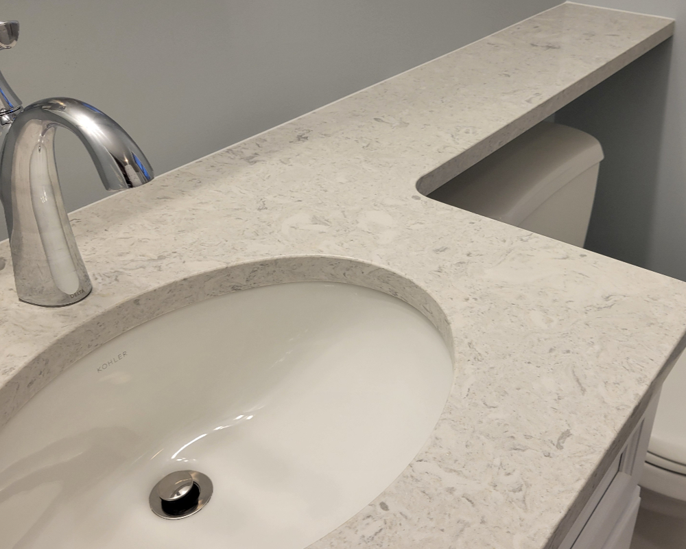 To solve the issue of limited storage and counter space, we fabricated a custom banjo-shaped Cambria quartz countertop. This allowed the counter to extend over the toilet without needing structural cabinetry beneath it. Steel brackets hidden underneath support the extended surface and prevent flexing or damage over time. The result is a clean, functional design that maximizes space without feeling crowded.