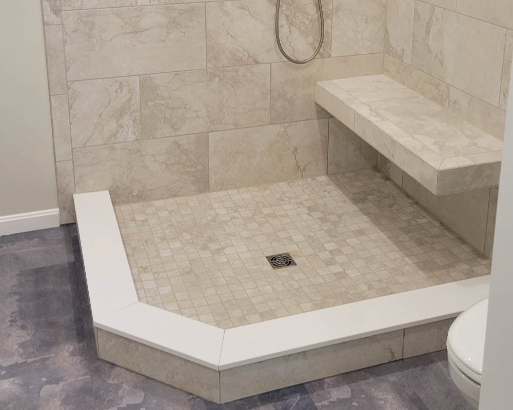 Materials: Florida Tile Tuscan Villa Arezzo Ivory, Bostik TruColor grout, CounterTek Tindra top, Bertch Cabinetry, Moen fixtures, Schluter drain, Innovis Better Bench